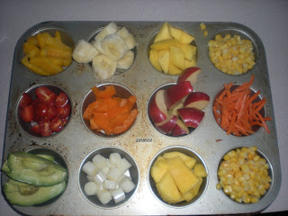 (Ideas to fill it with: strawberries, grapes, sliced bananas, oranges, kiwi, mango (my kids fav!), gold fish, cheese sticks-sliced, carrots, broccoli, avocado, corn, cauliflower (you can even buy the purple kind), yellow, red, and/or green peppers...to name a few. Switch it up! Do not serve these with any dips...you want your children to appreciate the naturally flavors of these yummy foods! (Thanks to my sis. for this idea--we love it!)